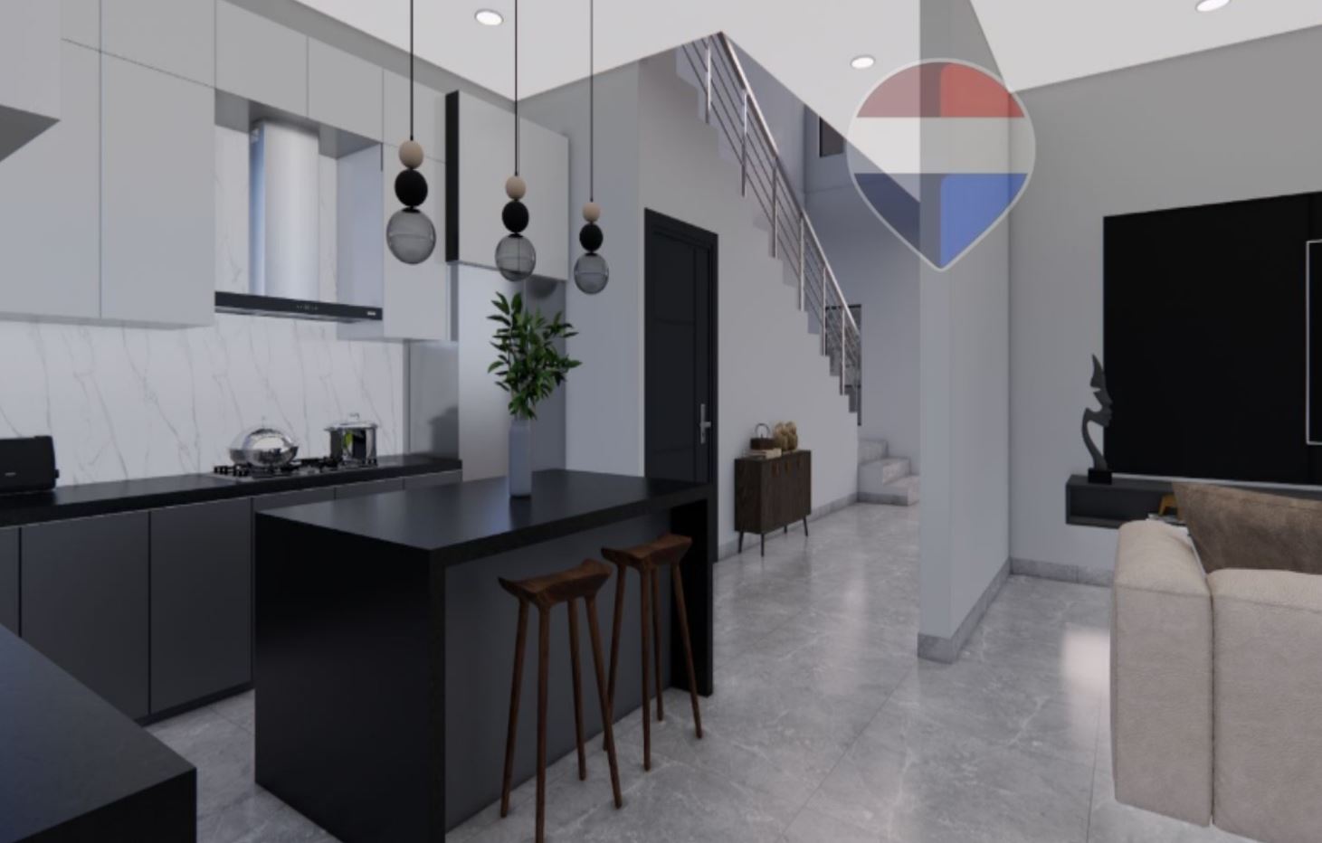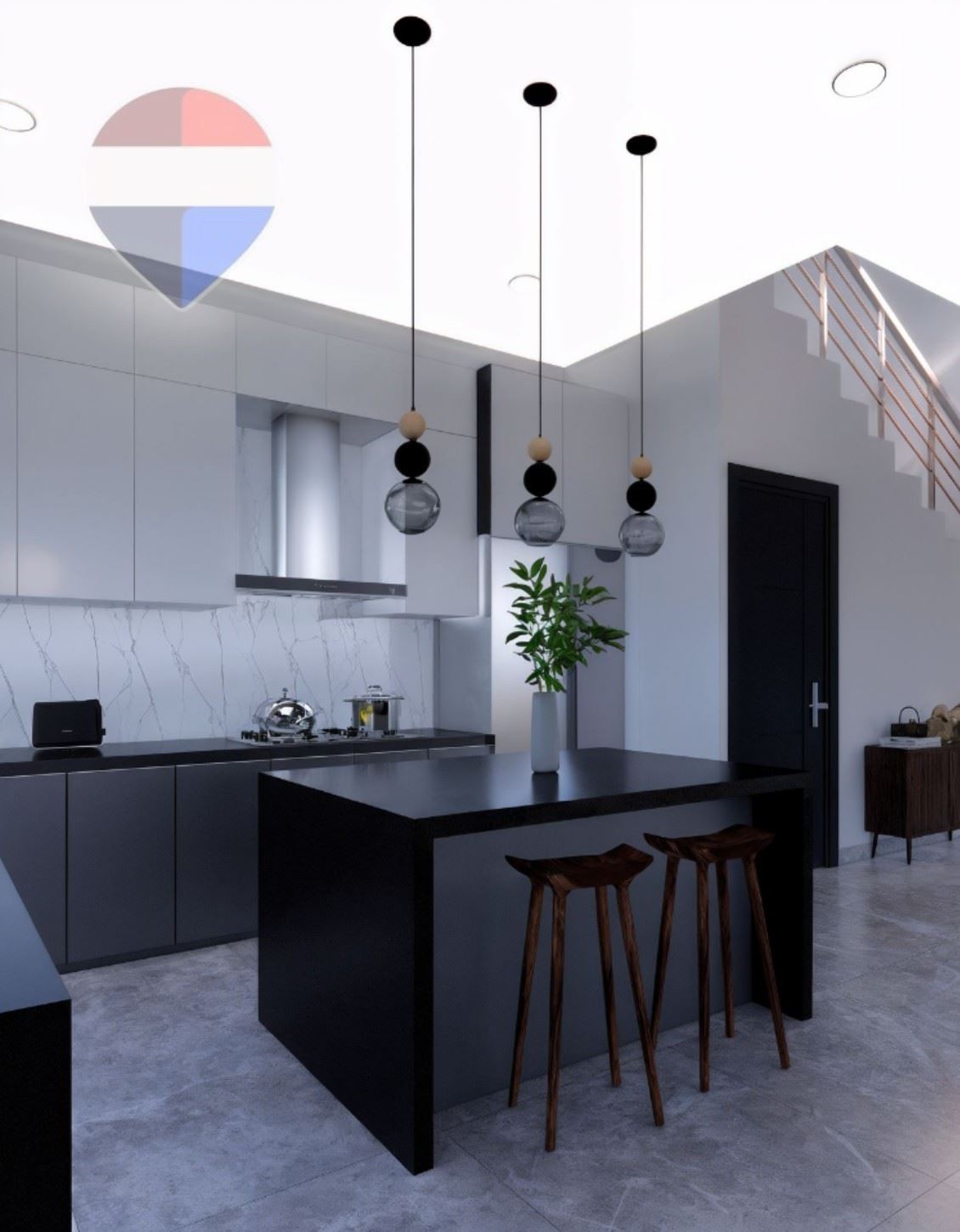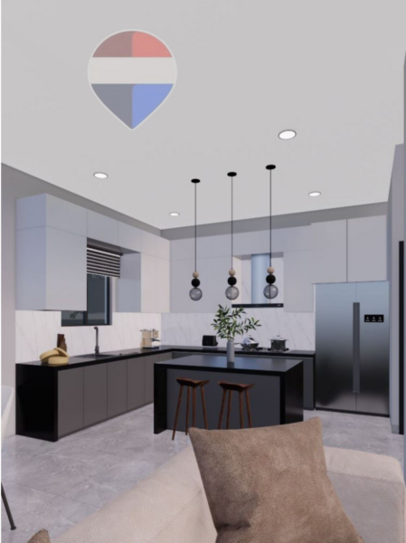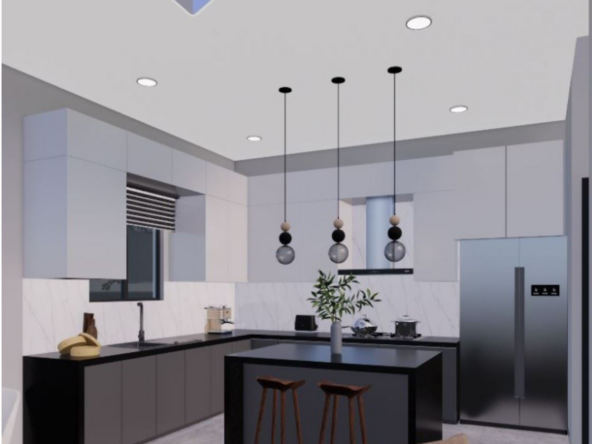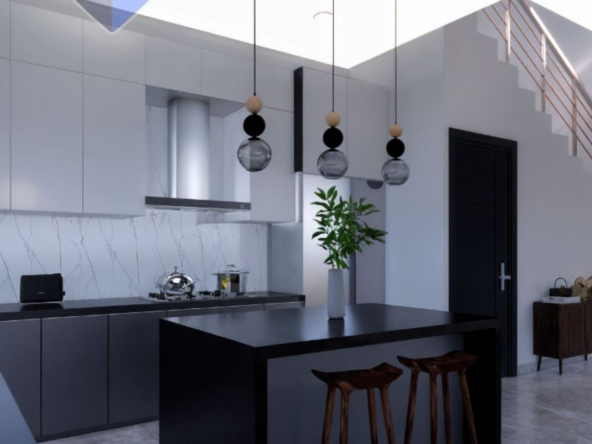 Cocina de ensueño con isla central, amplias encimeras de cuarzo y práctico pantrie.