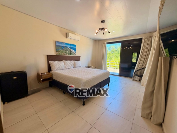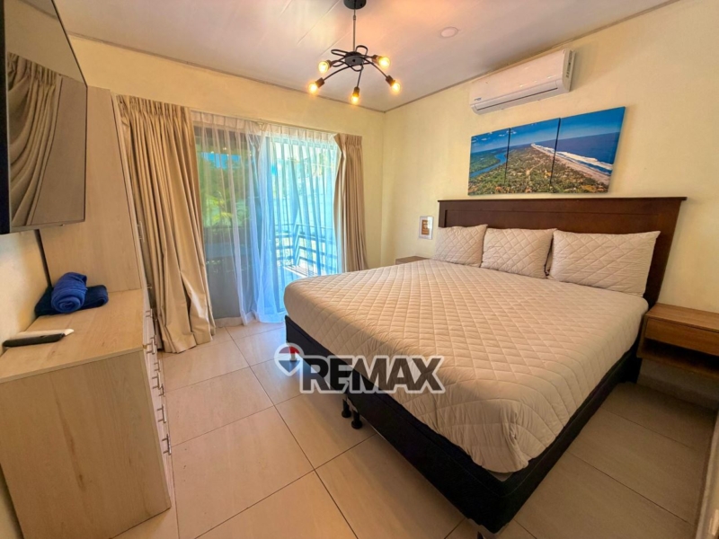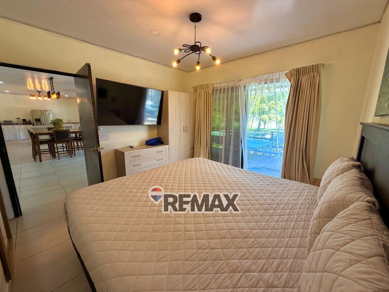 – ?Habitación principal con acceso a la terraza y vista a la piscina, cuenta con baño completo, equipada con A/C, T.V., closet y cama king size.